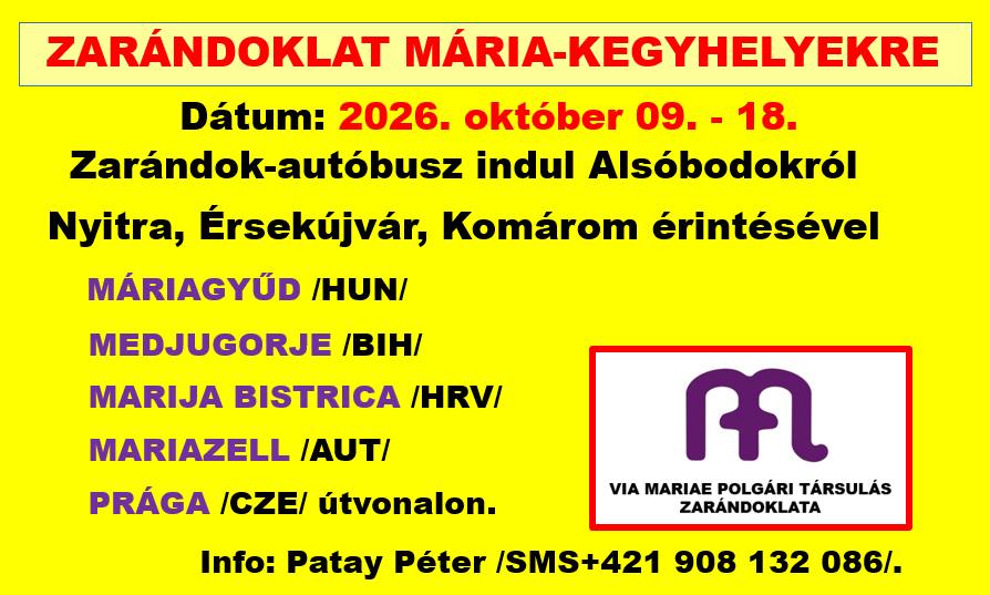 Már lehet jelentkezni a 2026. október 09-től 18-ig Mária-kegyhelyekre tervezett 10-napos autóbuszos zarándoklatra: Máriagyűd /Magyarország/, Medjugorje /Bosznia-Hercegovina/, Marija Bistrica /Horvátország/, Mariazell /Ausztria/, Prága /Csehország/.
