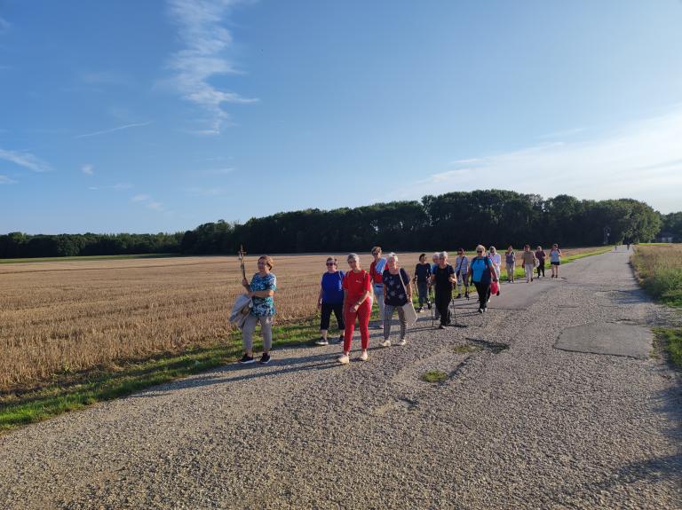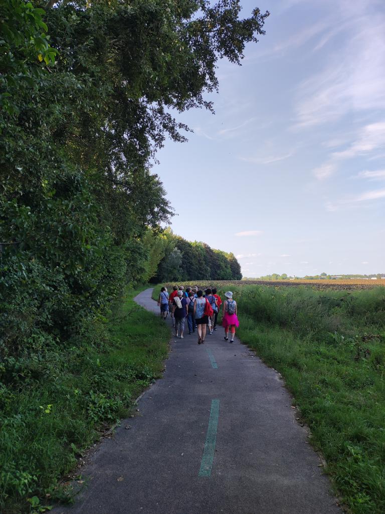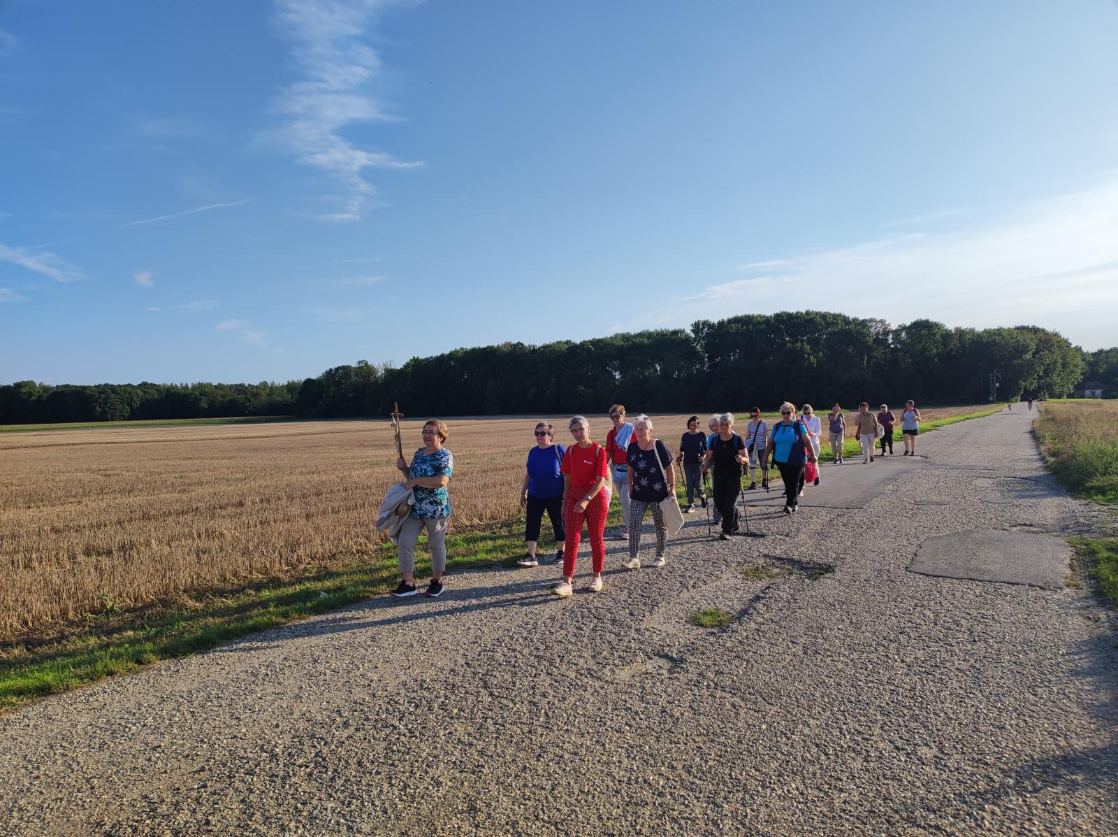 Mária énekkel indultak el a templomtól. Az 5 km-es út nagyrészt kerékpárúton, majd betonúton és földúton vezetett. Az út során elimádkozták a fájdalmas rózsafüzért, melynek minden tizedét más-más zarándok imádkozta elő, felajánlva különböző szándékra. Az imát rövid csendszakasz követte, amikor is a zarándokok a lelkük csendjében Istenre figyelhettek és elmerülhettek az ő szeretetében.