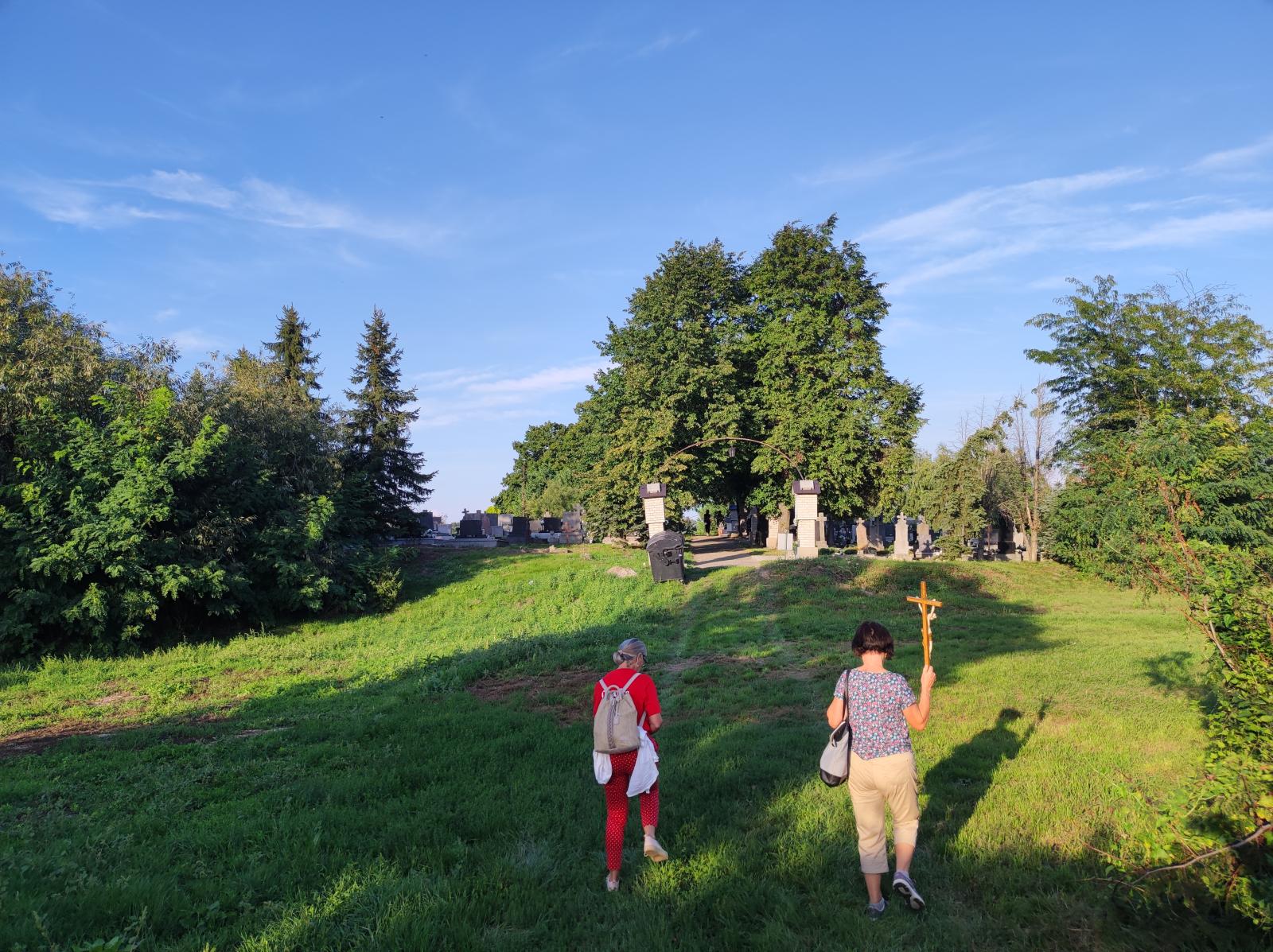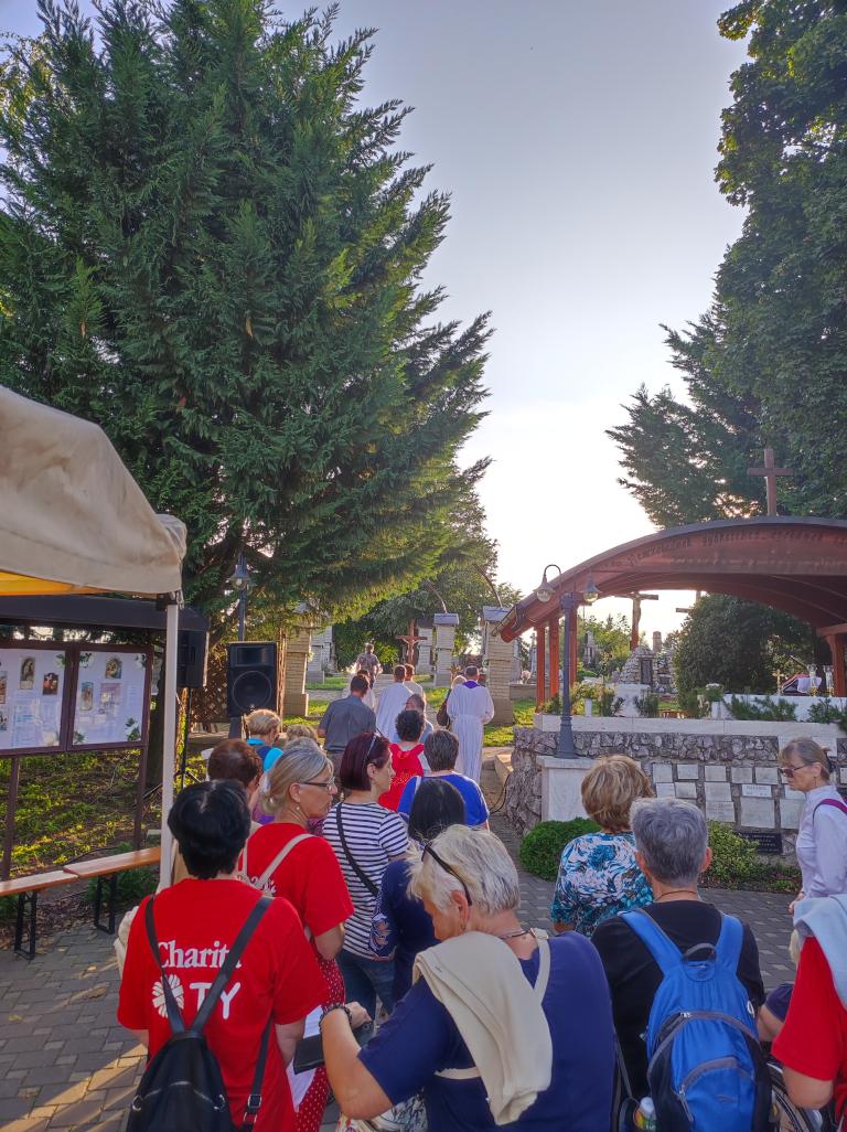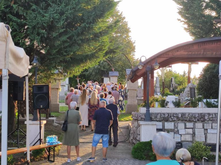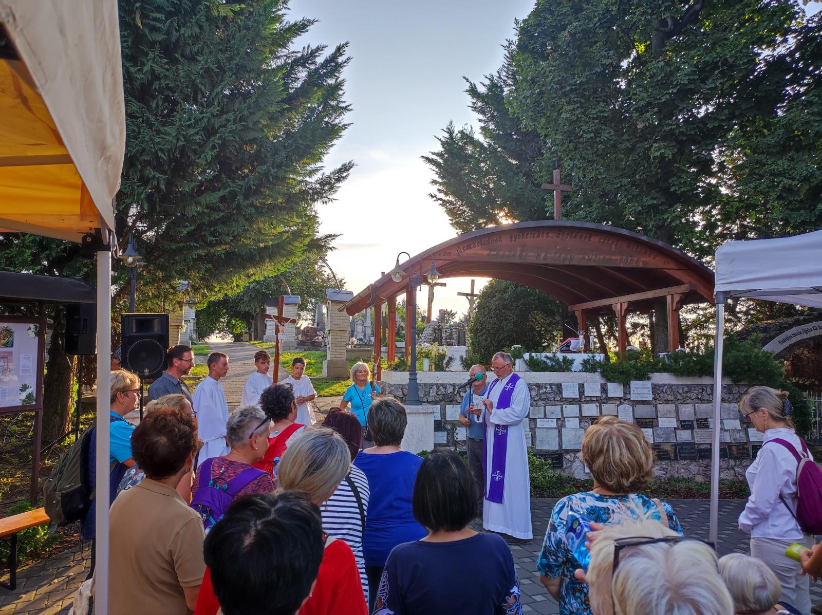 Kis pihenő után közösen elimádkozták az Isteni irgalmasság rózsafüzérét. Mária énekkel vonultak a temetőben található Lourdes-i barlanghoz. Itt a helyi hívekkel együtt, Puss Sándor jezsuita atya vezetésével elvégezték a keresztutat. A szentmise főcelebránsa és szónoka is Sándor atya volt, aki homíliájában utalt, hogy elvesznek az emberi értékek, újra kell teremteni az emberek közötti kapcsolatokat.