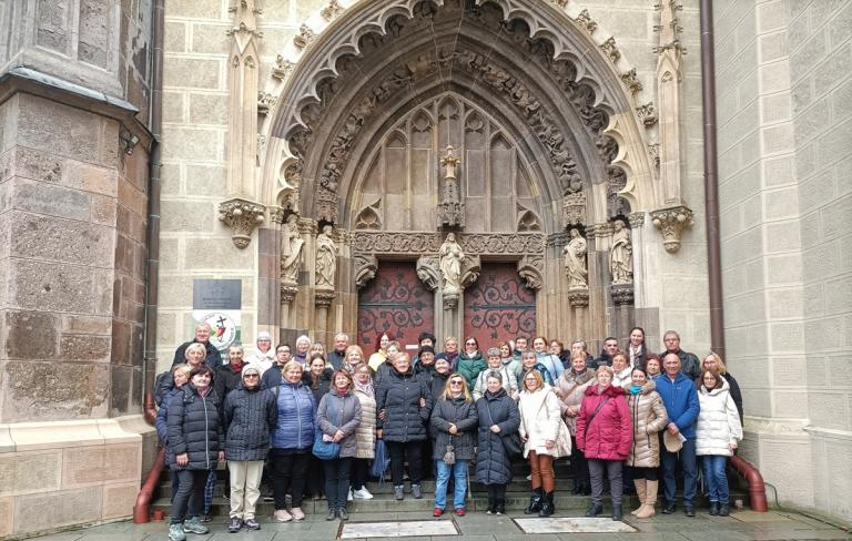 Zarándokcsoport a szentbenedeki székesegyház előtt (Fotó: Via Mariae Pt.)